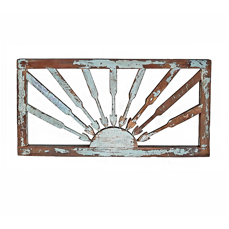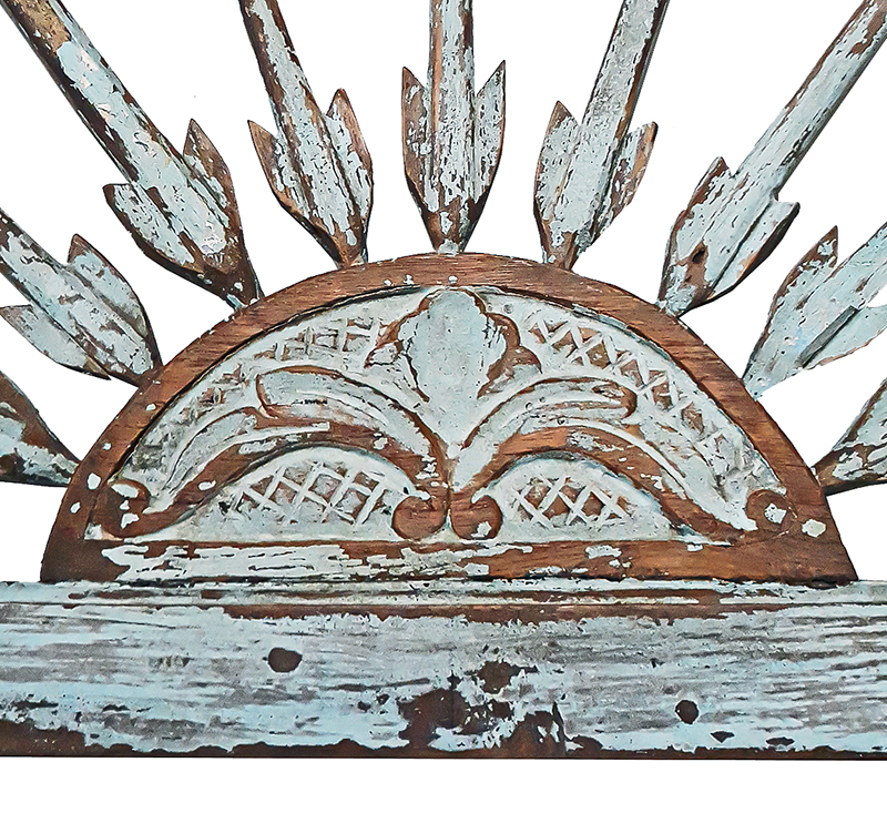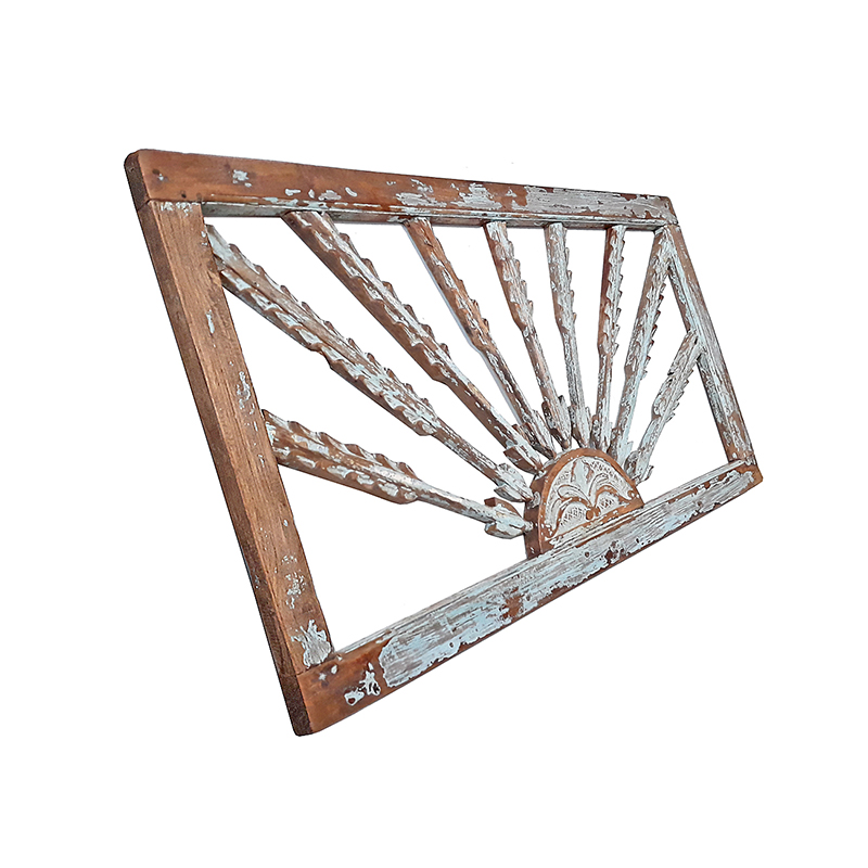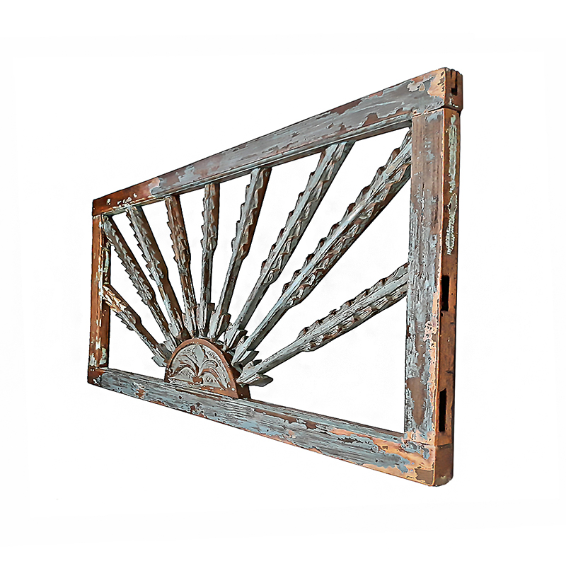Hand-carved teak wood, with its original grey/blue color paint in the frame, naturally distressed by time and the elements.