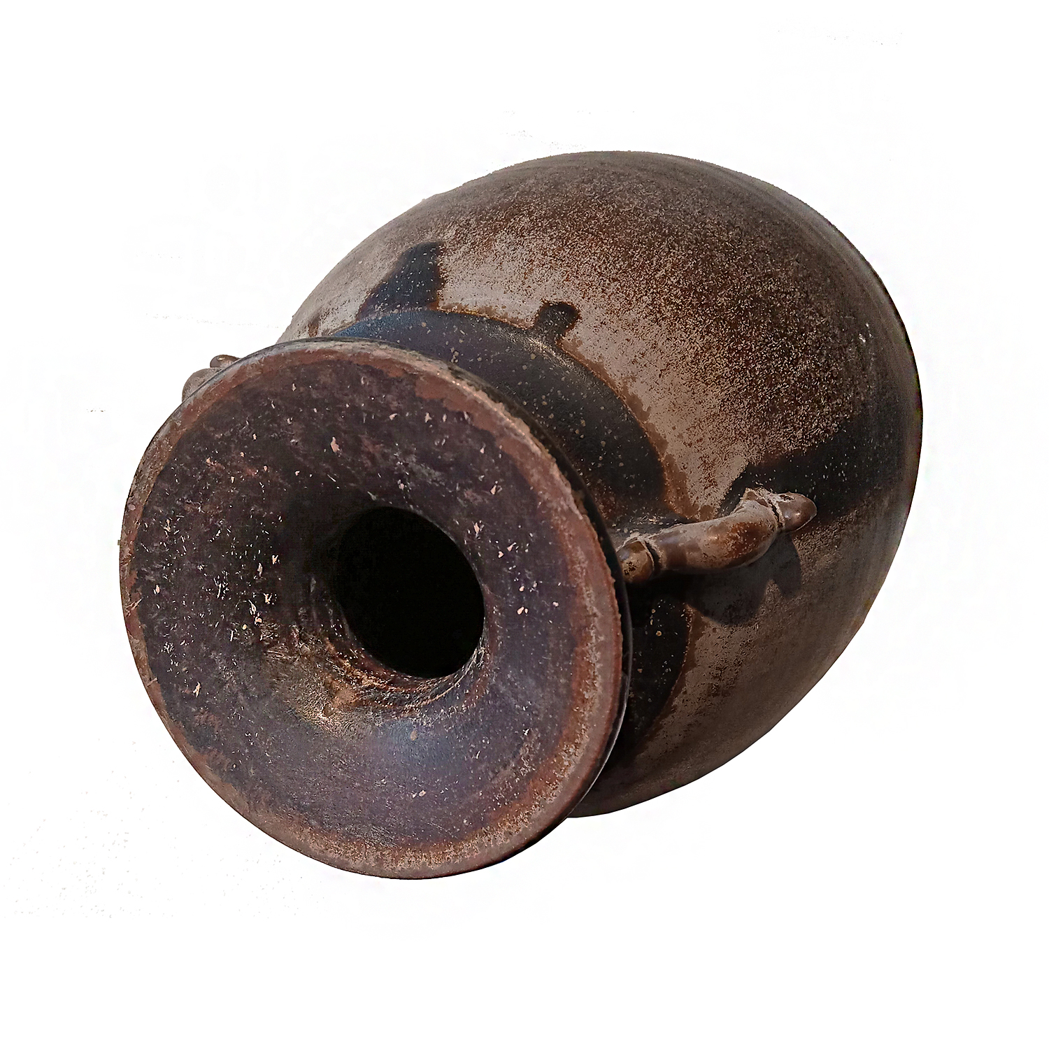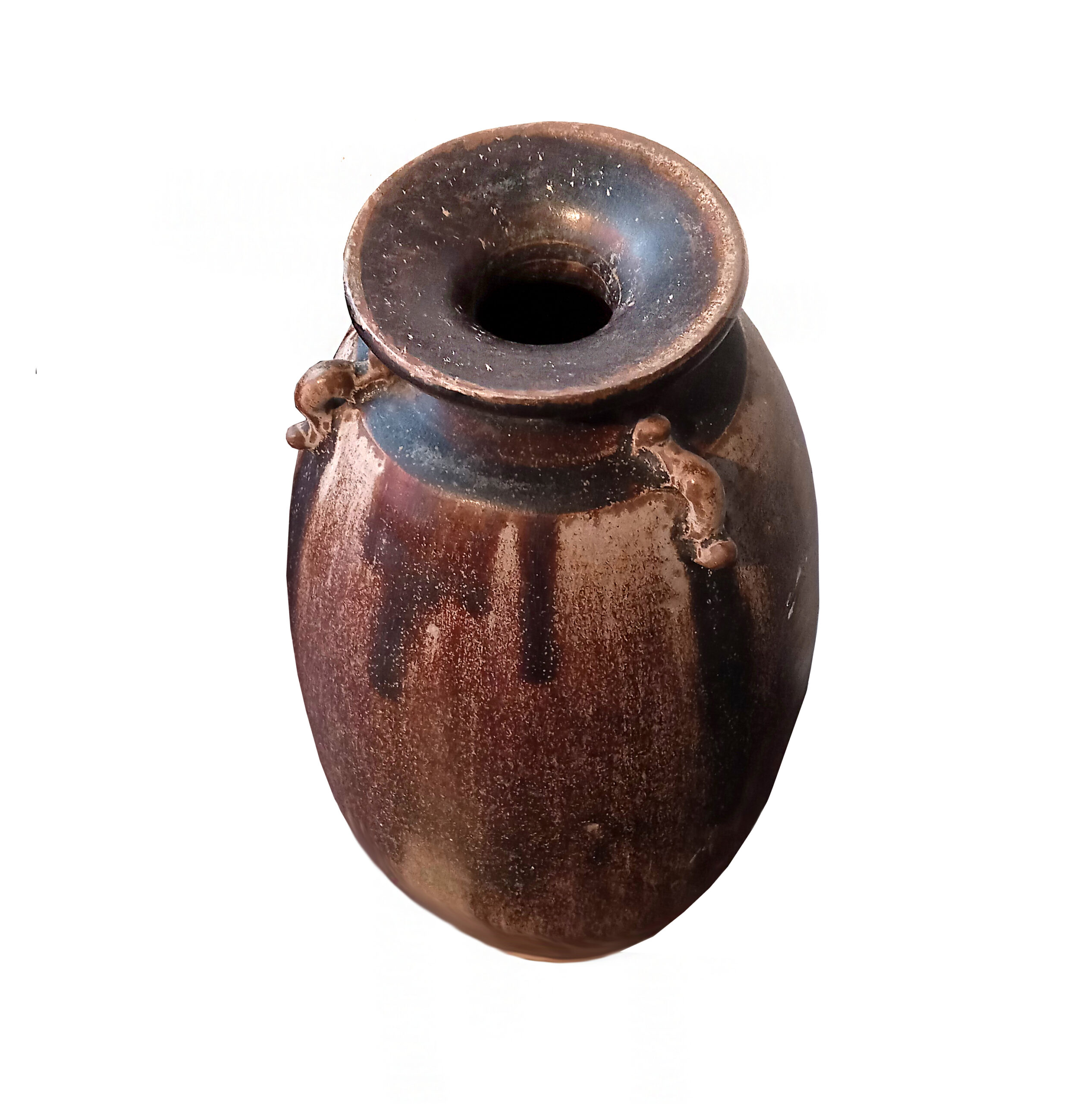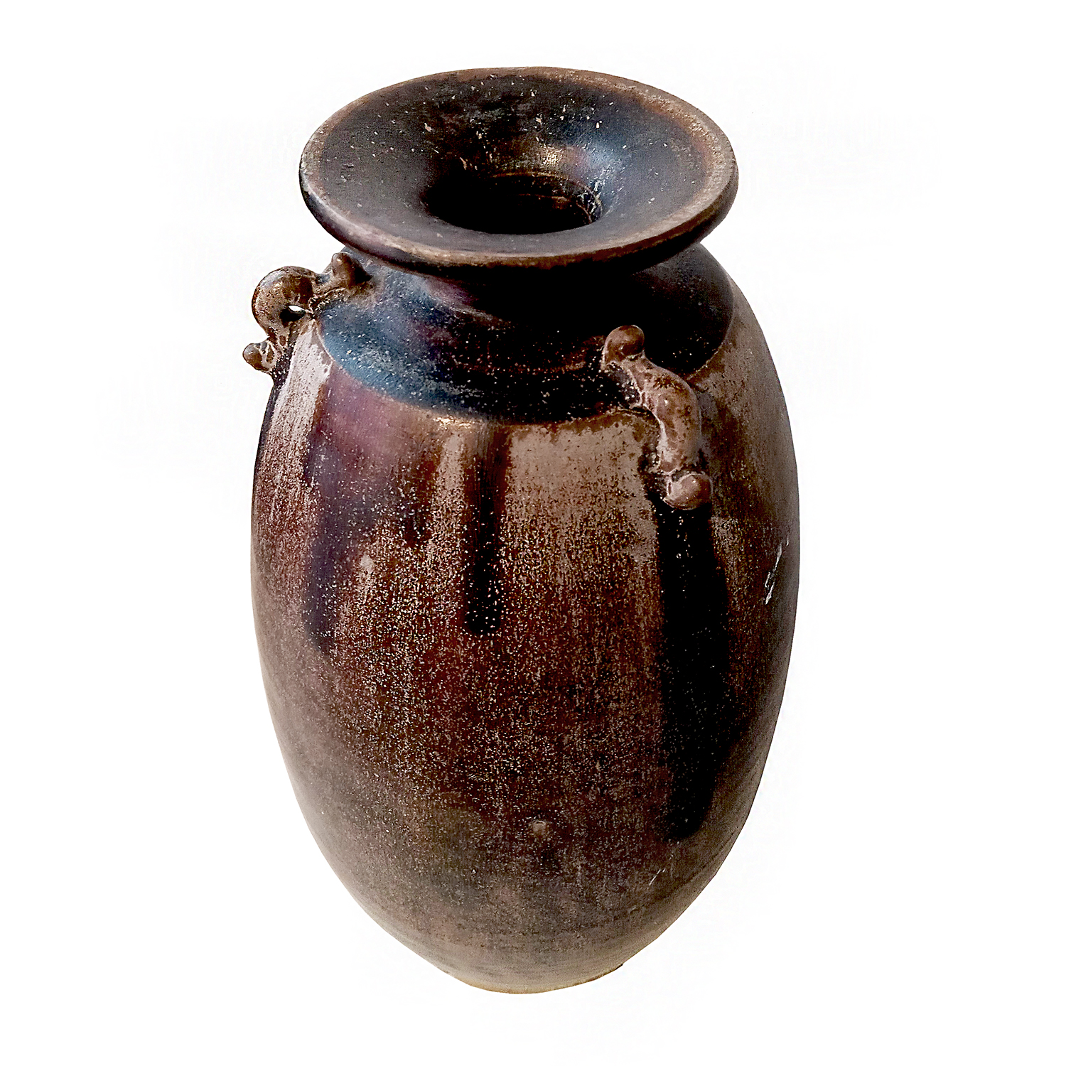 With its mottled brown glaze, this piece makes for a unique decorative piece.