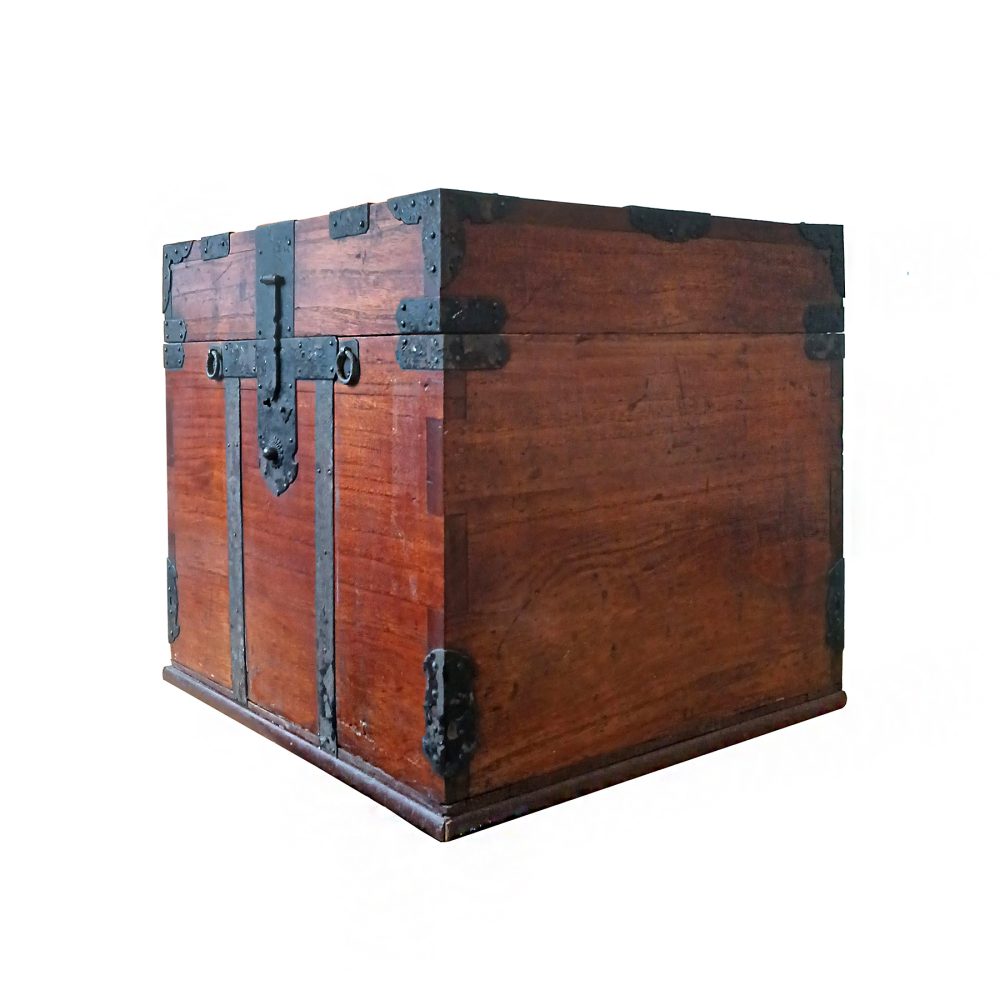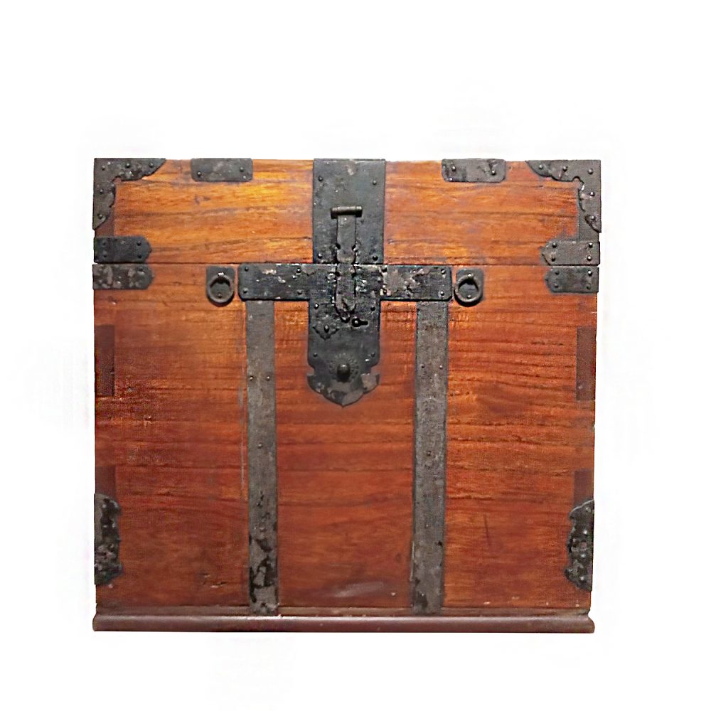 A Japanese wooden storage box, circa 1890. Meiji Period. Cedar wood body, wrought iron trimming. Loose lid.