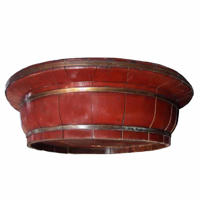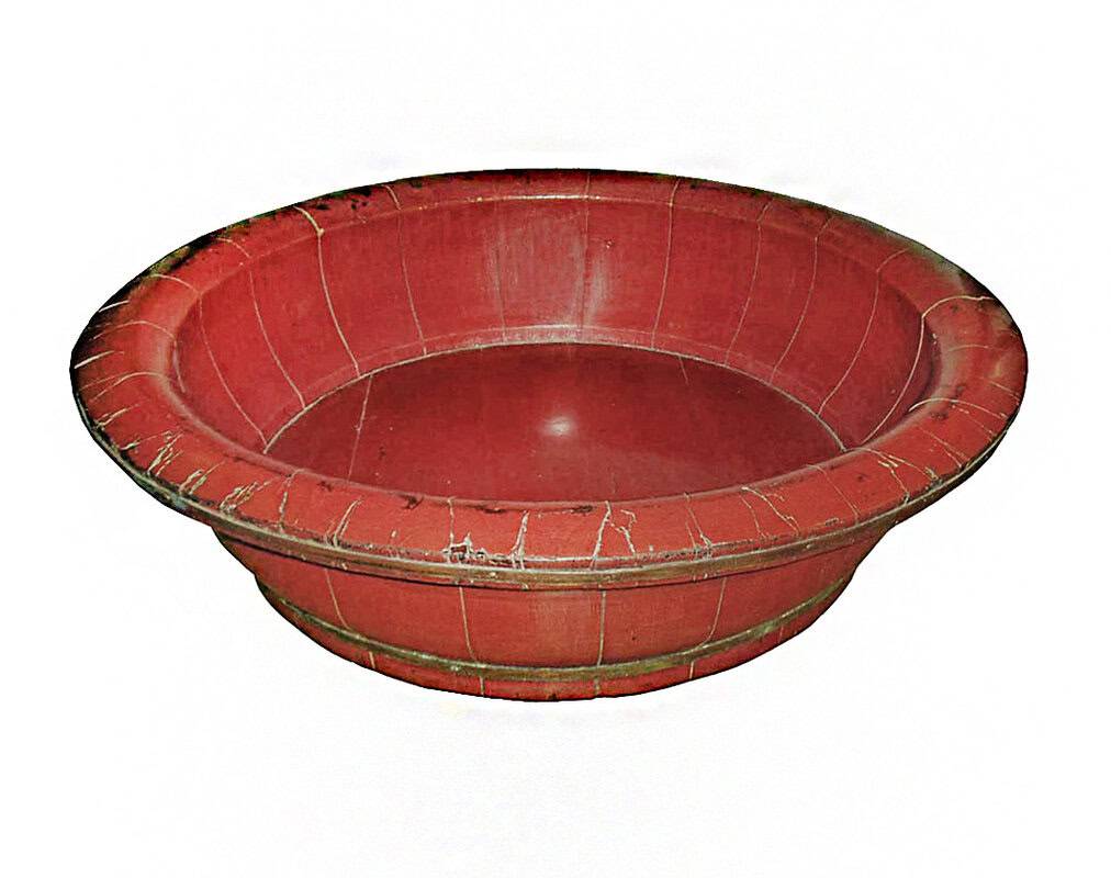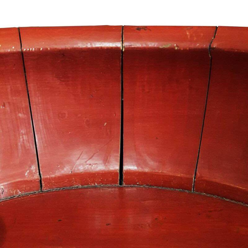 A large Chinese basin or bowl hand-crafted in peach wood, with red lacquer finish and forged bronze braces, circa 1880.