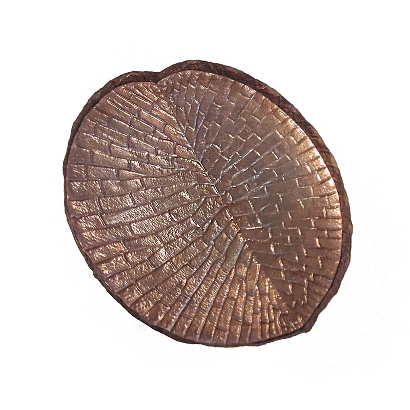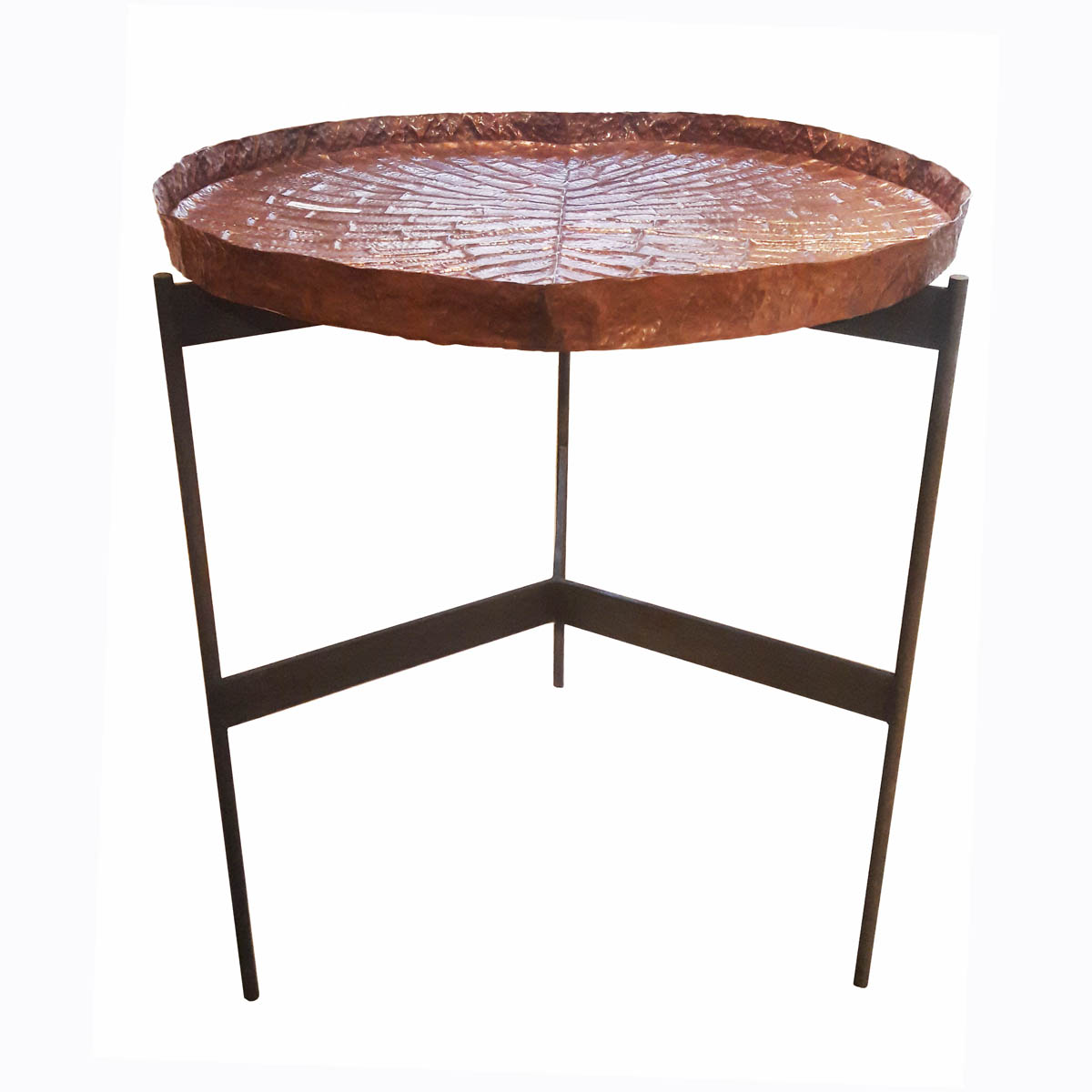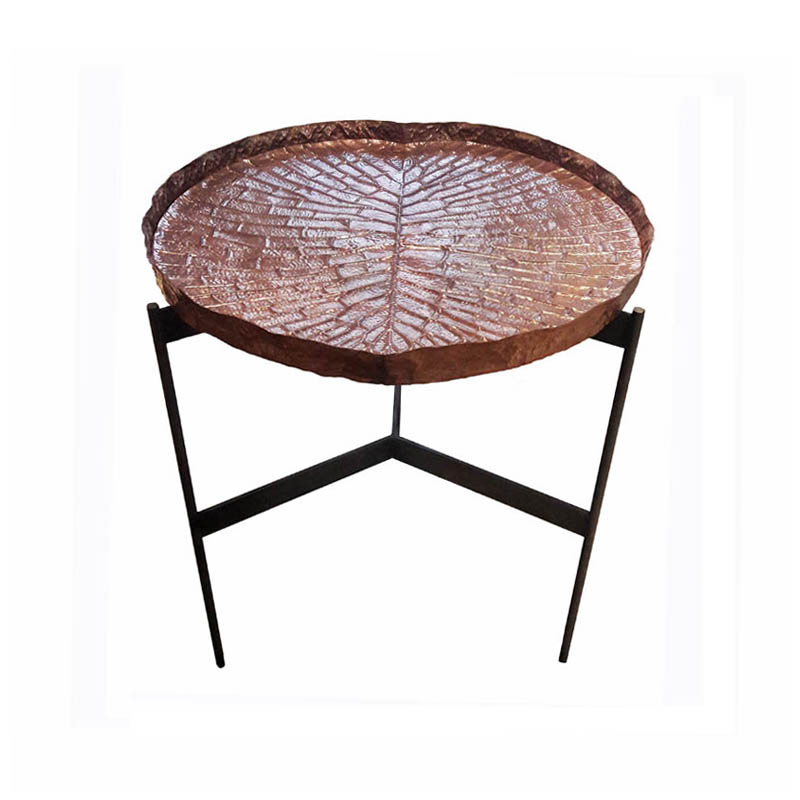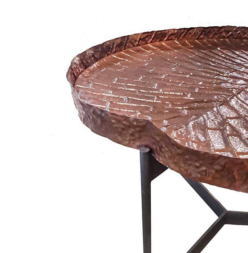 A high table with a hammered copper tray resembling a water lotus leaf, on top of a wrought iron base.