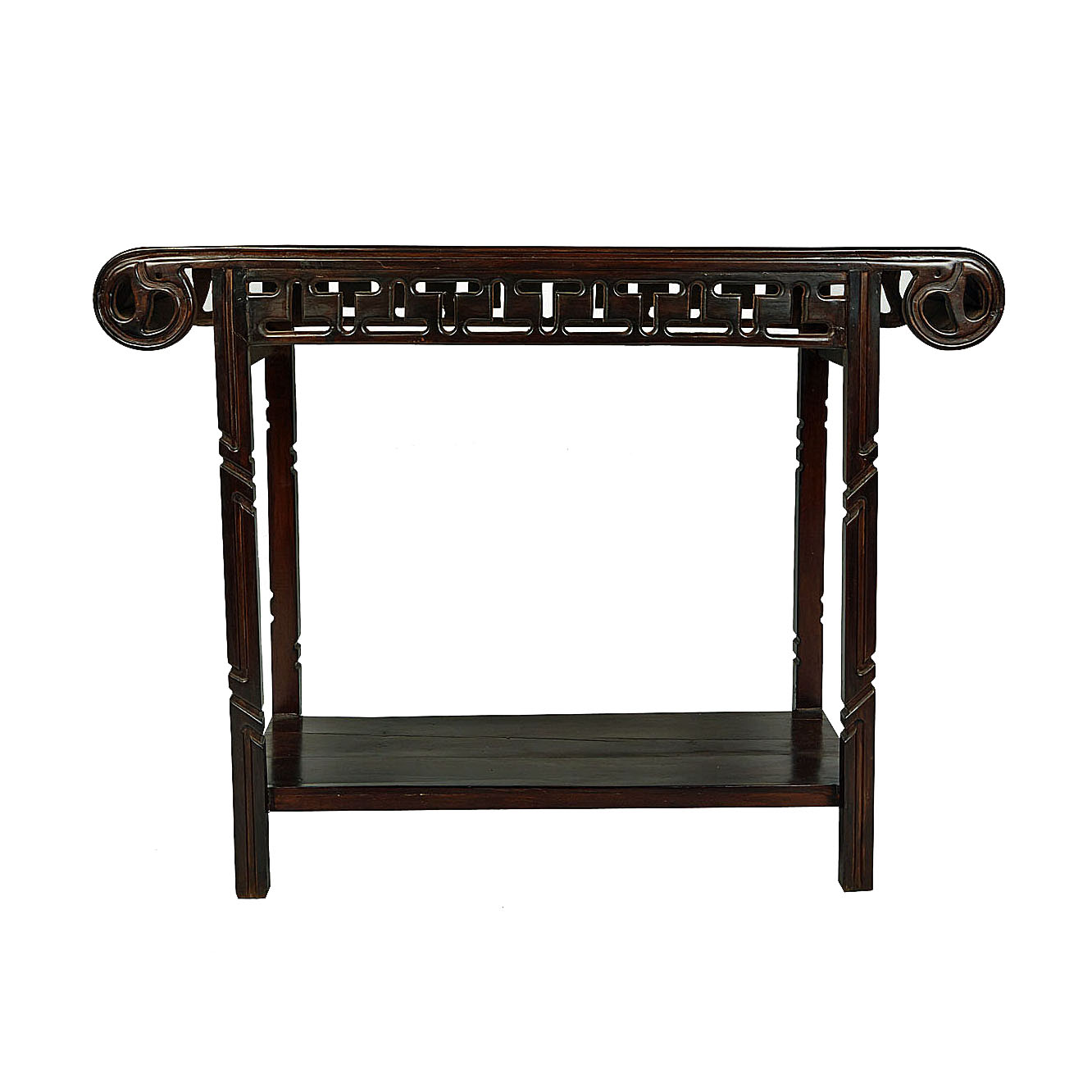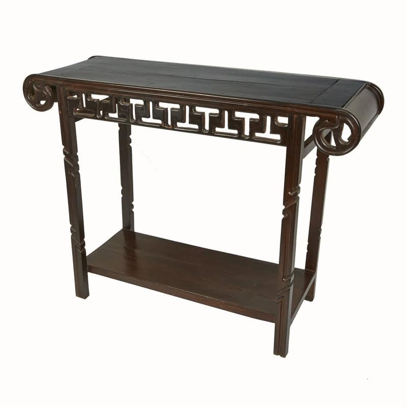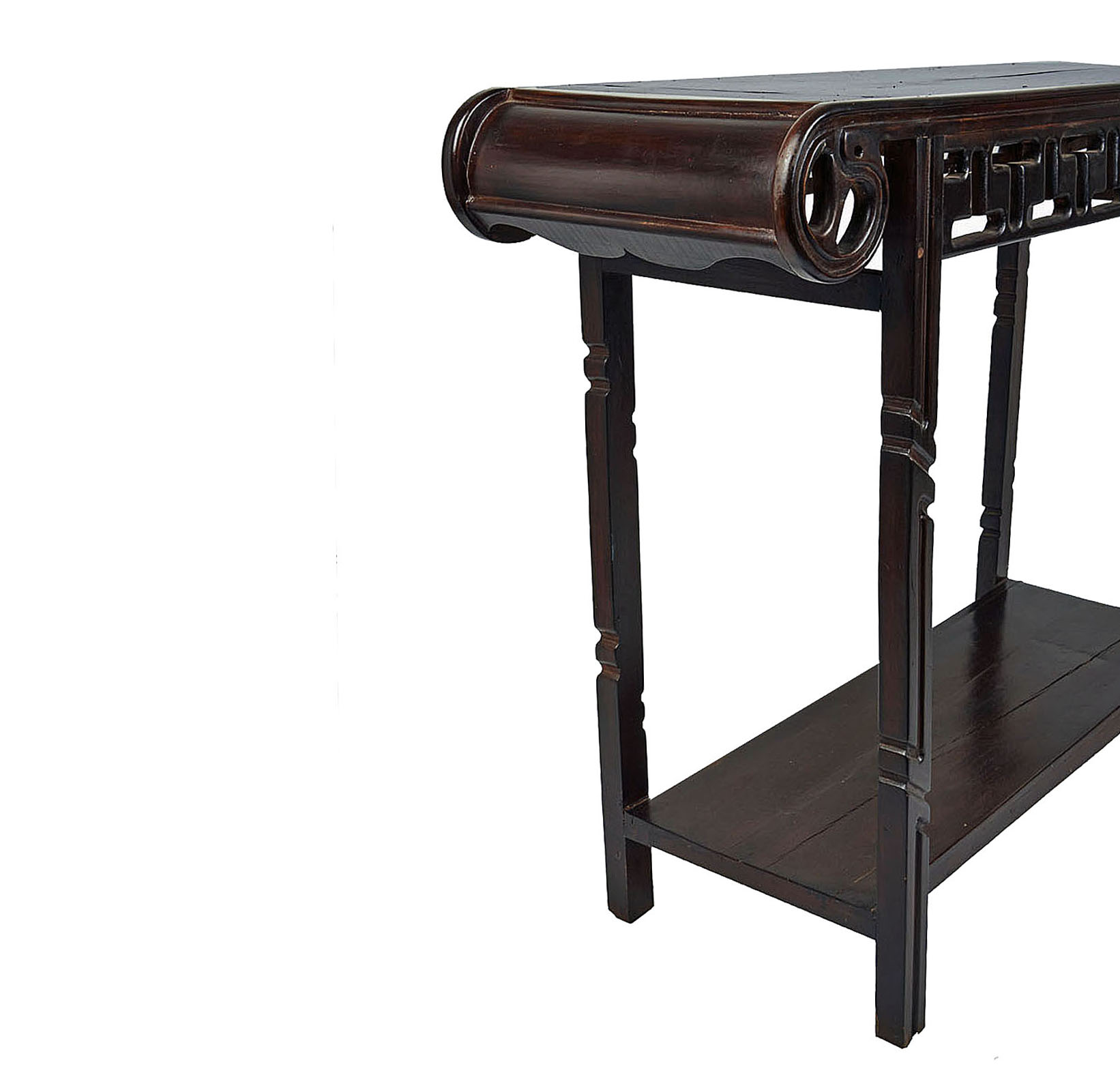 A lute top console table in dark-stained wood with carved details, latticed apron, turned legs and lower level shelf. Cambodia, Early 20th Century.