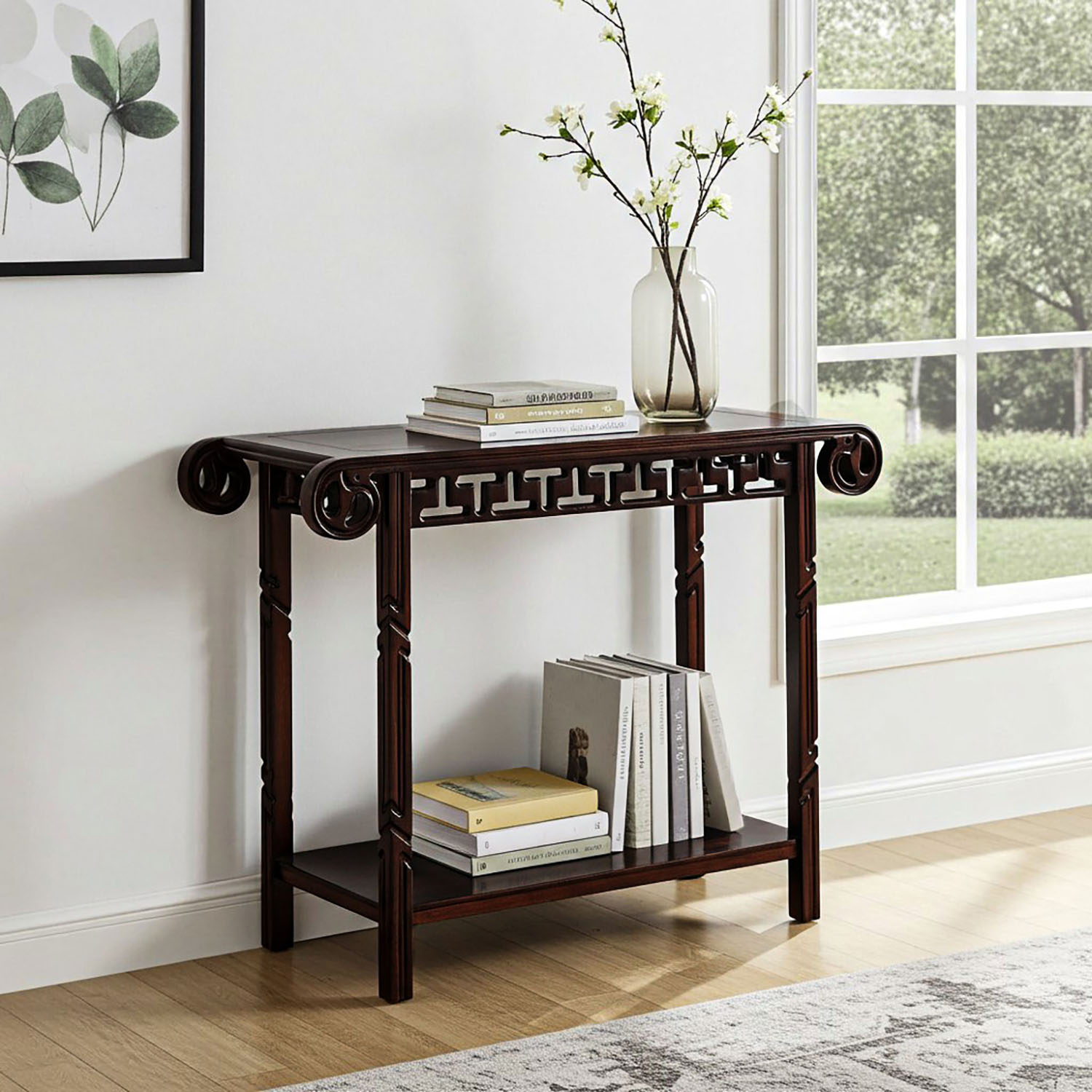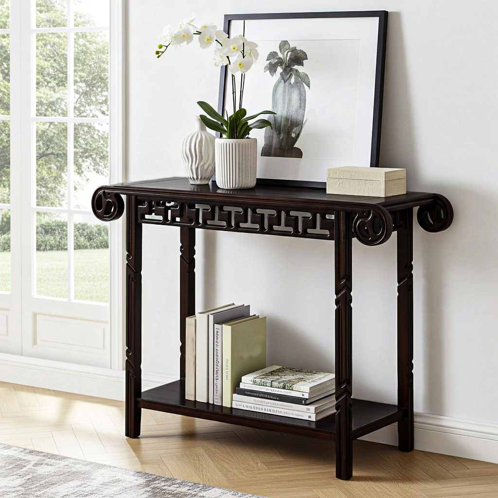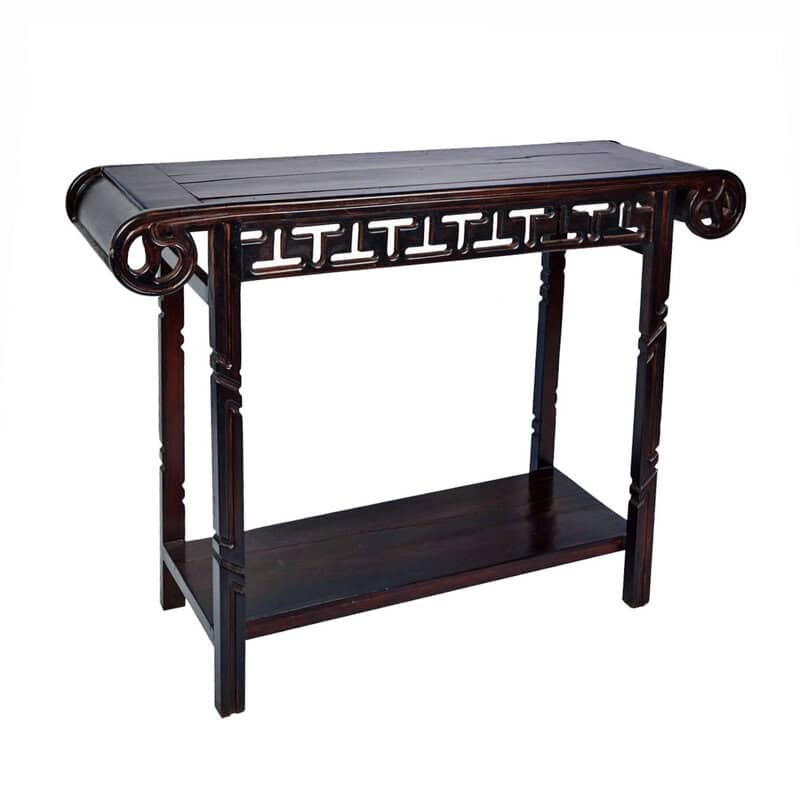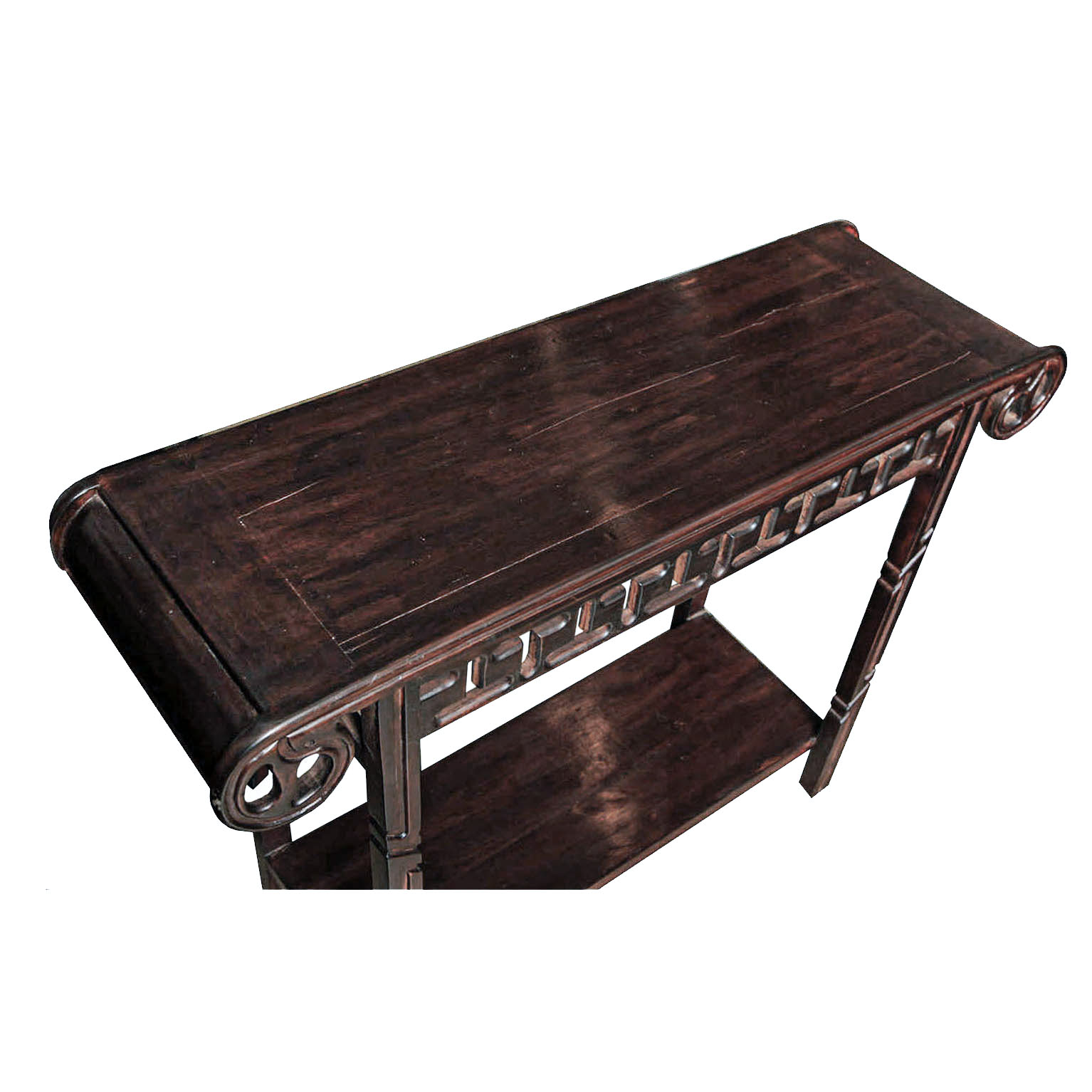 A lute top console table in dark-stained wood with carved details, latticed apron, turned legs and lower level shelf. Cambodia, Early 20th Century.