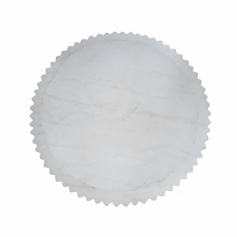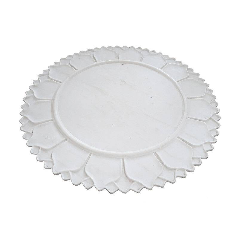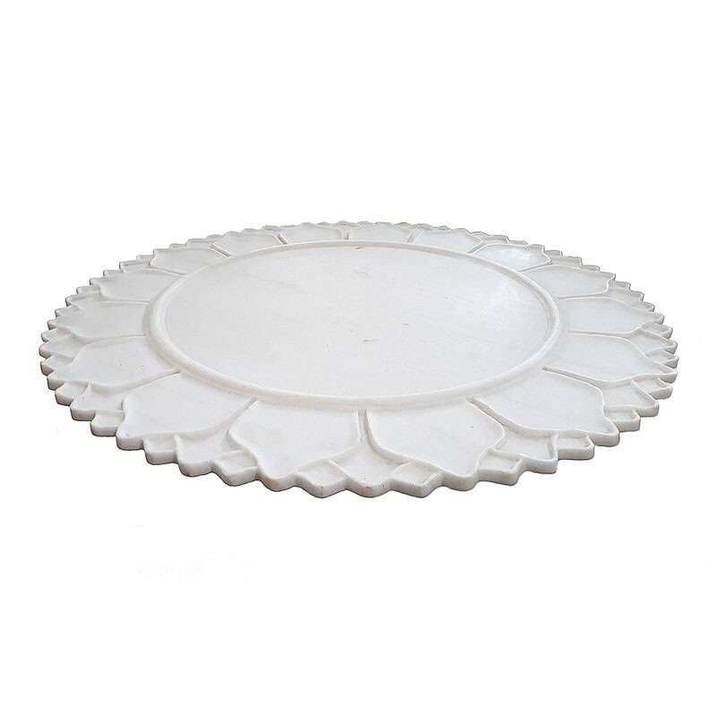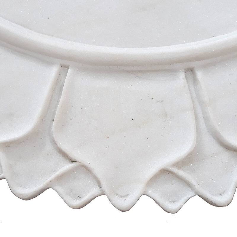 A superb marble charger / server / tray, hand-carved in India, late 1960s. Very well preserved. No signs of use, no losses or cracks. Smooth, low-veined white marble, polished and smoothed for a beautiful shiny appearance. 24 inches in diameter.