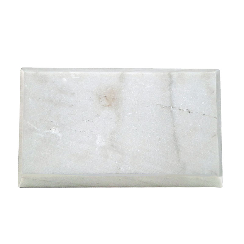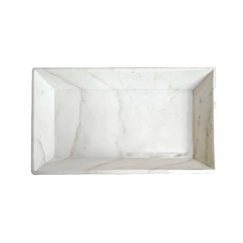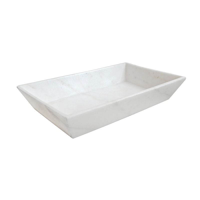A white marble tray from India with beveled sides. Sleek and elegant, this small tray is ideal as an accessories tray for a bedroom vanity, a bathroom hand towel tray, or as a decorative element in any other room.