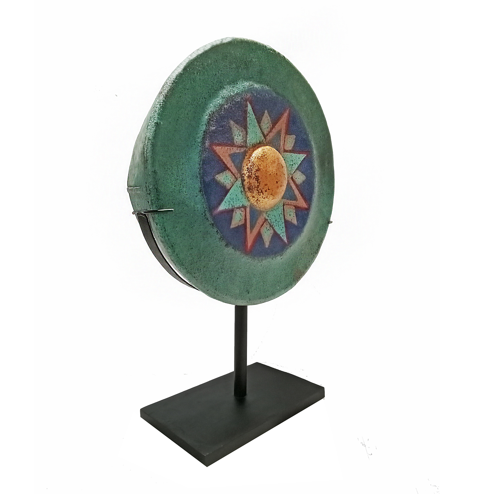 The front is polychromed in deep, well affixed colors simulating a star. The back has been left in its natural condition, revealing the metal’s original texture, color and patina.