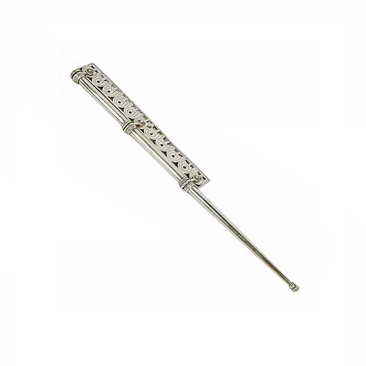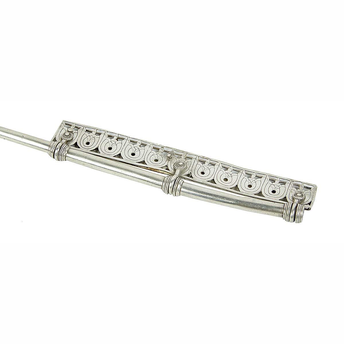 A Chinese feather fan holder, 19th Century. Turned silver, intricately engraved with traditional motifs and lotus-shaped decorations.