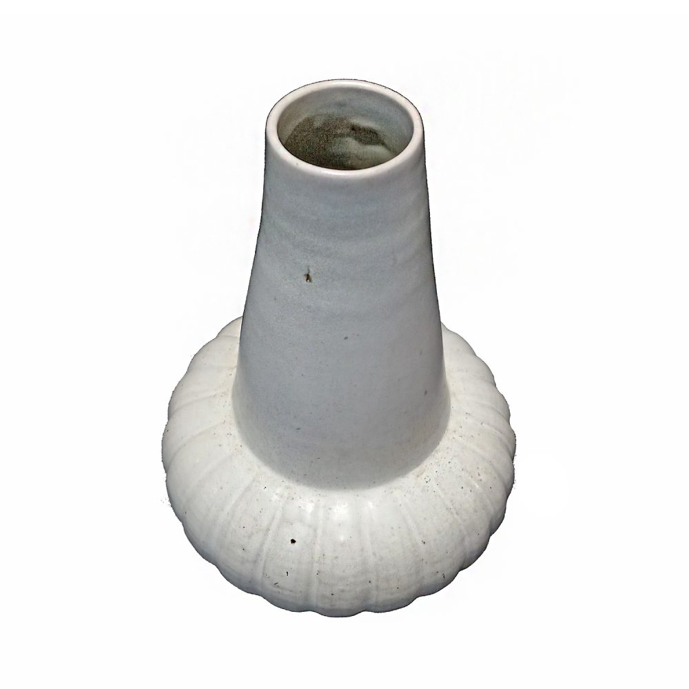 This contemporary vase is beautifully glazed in a semi-gloss off-white color, with a with a ridged circular body and a tapered neck.