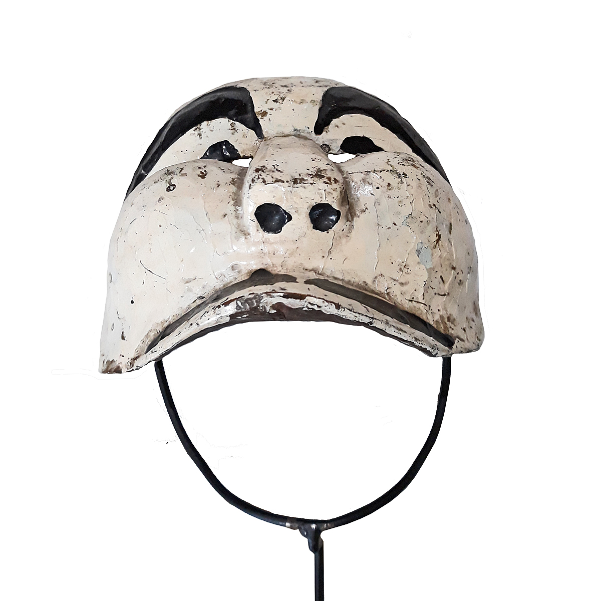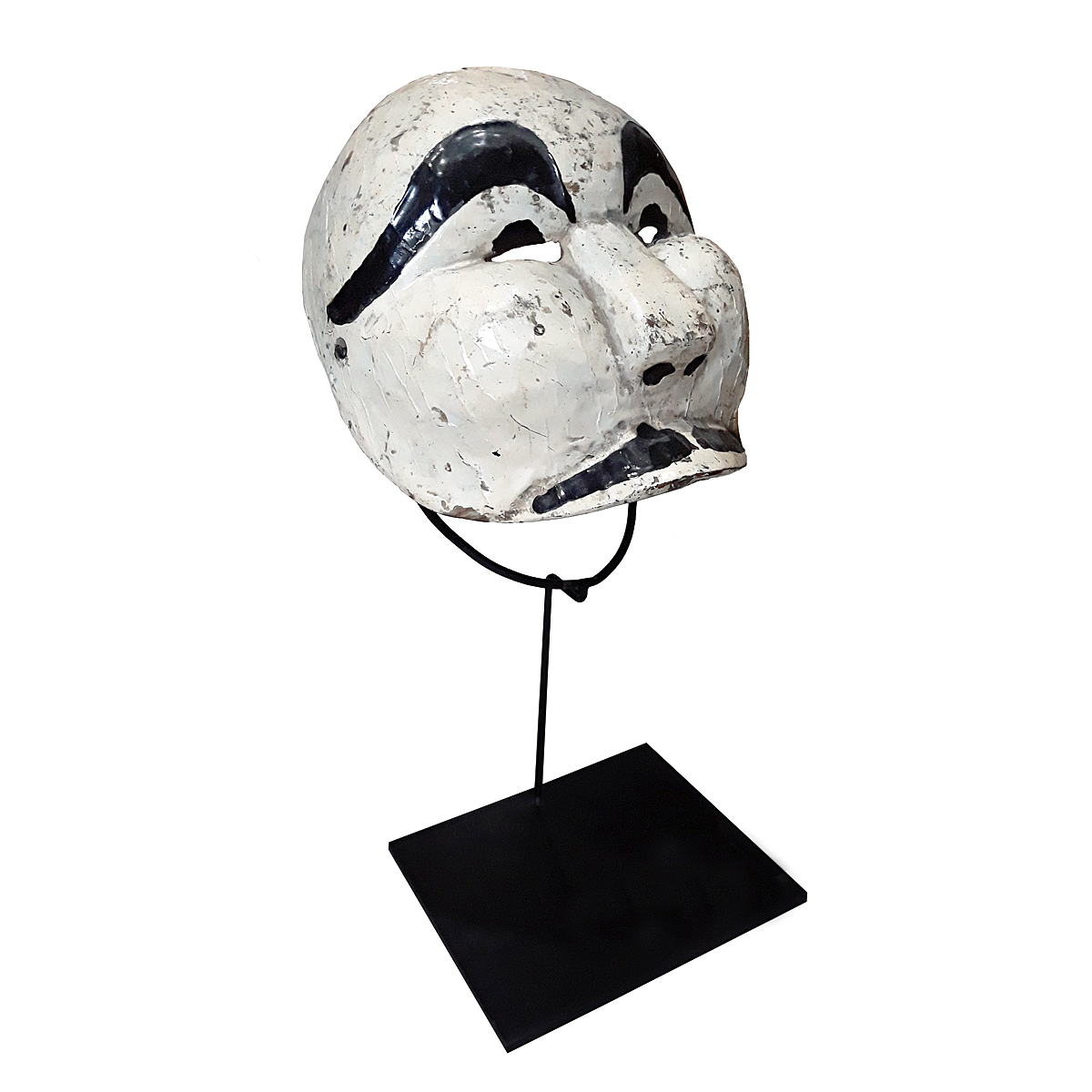 Hand-carved teak, polychromed in white and black. Mounted on a black metal stand.