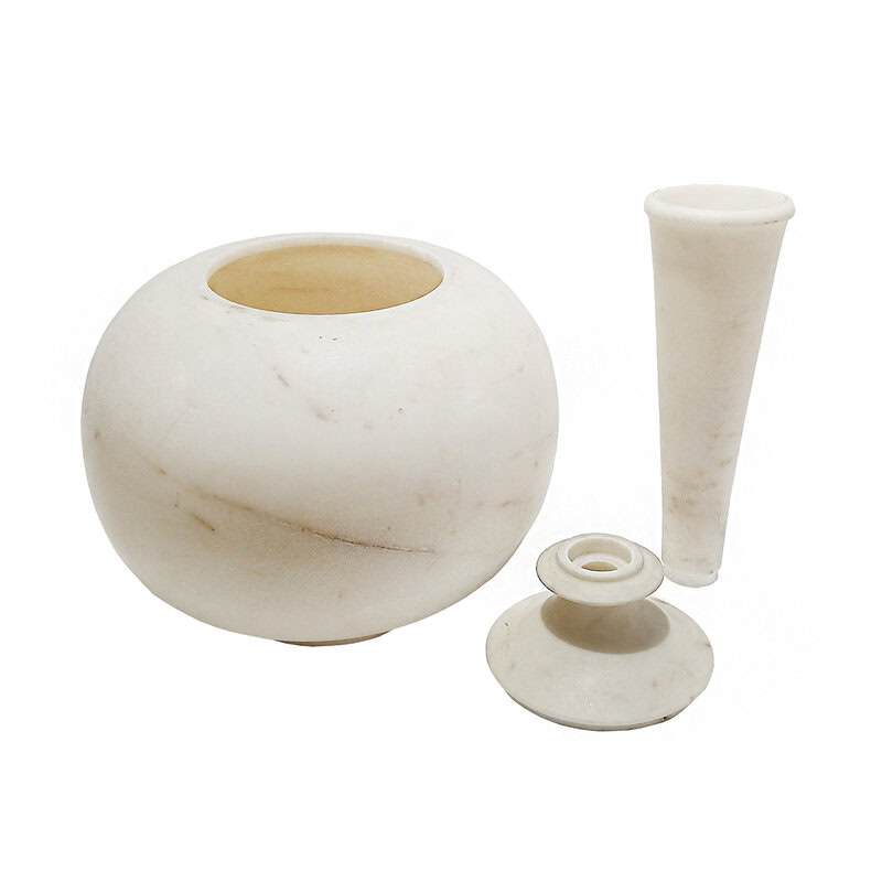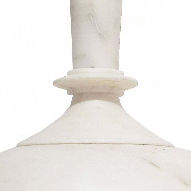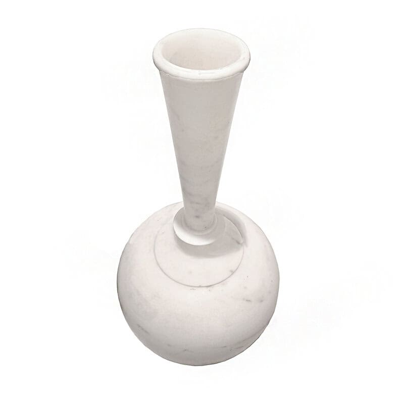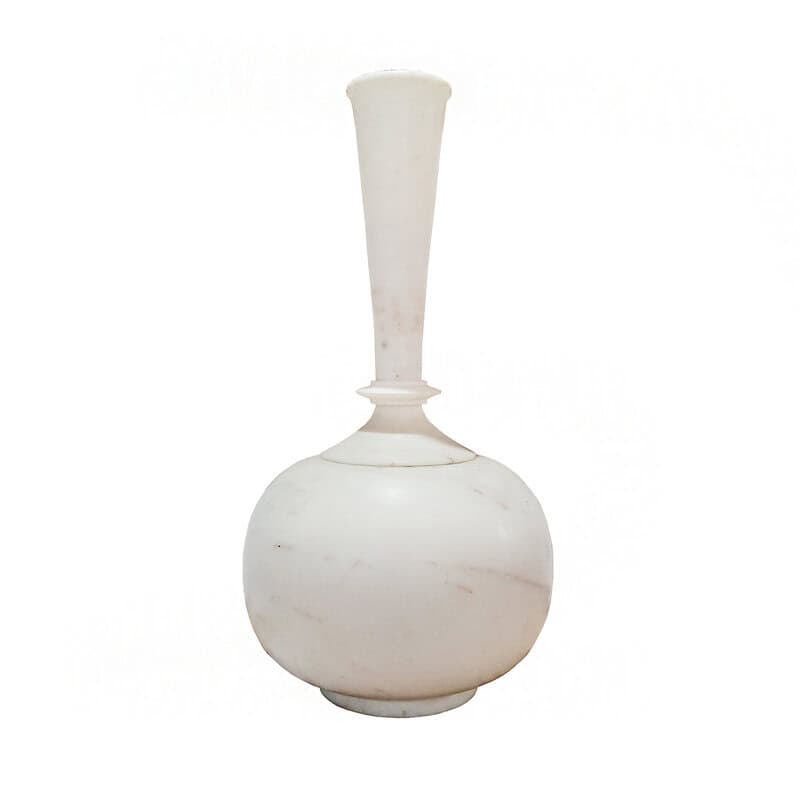 A white marble vase, hand-carved in India, circa 1960. 23 inches tall, approximately 12 inches diameter. Fluted neck. Clean, simple, elegant lines. The vase is composed of three separate parts: The round base, which can be used for wide floral arrangements; the neck base, with a stylized carving which accommodates the third part, a long fluted neck measuring 3.75 inches in diameter at the top. The neck base has a small loss, which does not affect the stability or the integrity of the vase. Superb vintage condition.