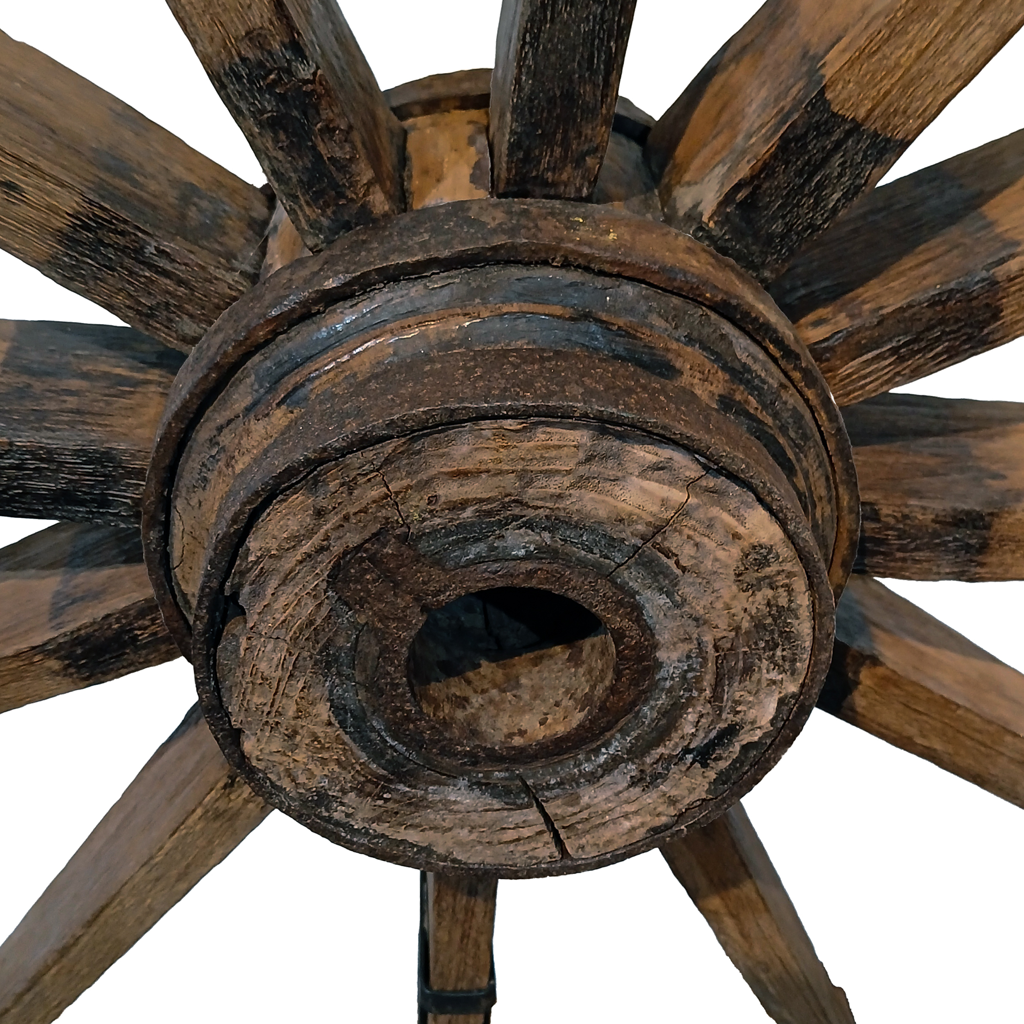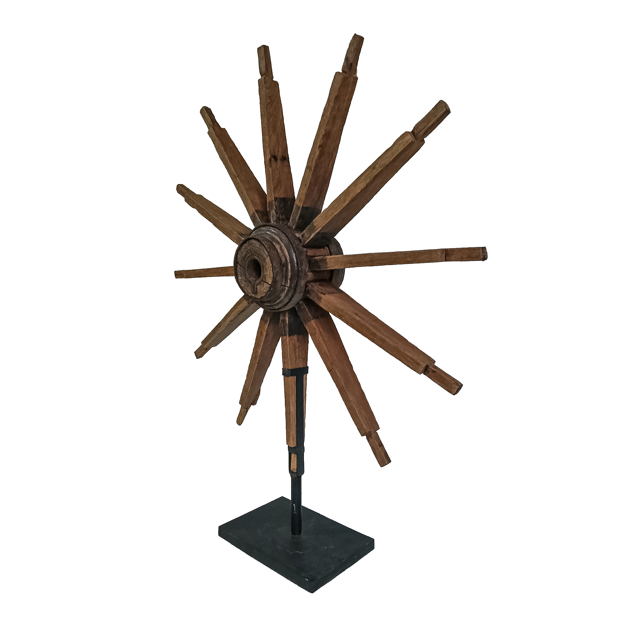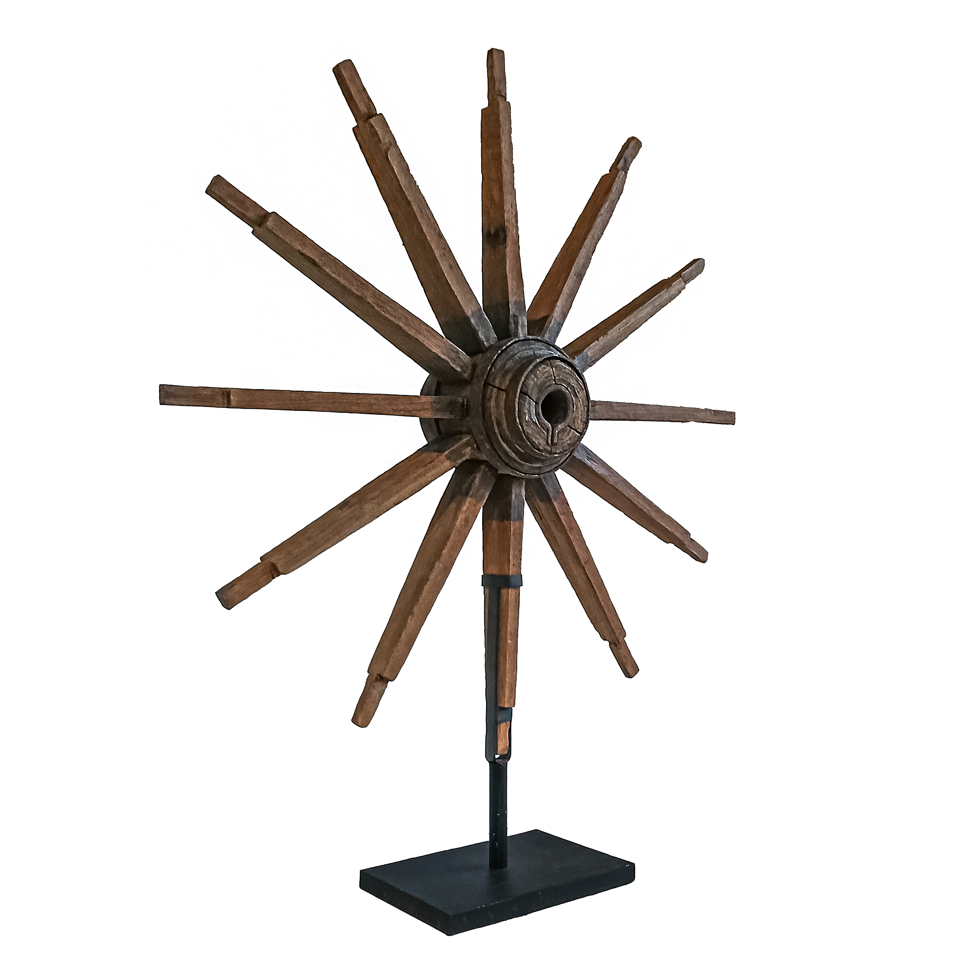 A wooden wagon wheel on stand. Indonesia, late 19th Century.